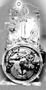 Un petit balancier a été soudé au cliquet du rouage de trotteuse pour obtenir une pulsation lumineuse par seconde. La cloche située sous la partie inférieure du cadran reçoit le marteau de sonnerie. Deux lampes de 0.5v éclairent la base. L’horloge fonctionne sur transfo.